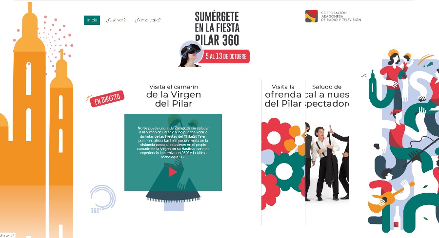 Esta página reune cuatro tipos de contenidos: los videos y podcast de todos los especiales de las fiestas emitidos en Aragón TV y Aragón Radio, emisiones en streaming de directo: conciertos, eventos y los principales actos de las fiestas y la señal de las cámaras inmersivas 4K / 360º. Este tipo de cámaras permitirán entrar al camarín de la Virgen en la Basílica del Pilar y moverse por su interior, disfrutar de los prolegómenos del Pregón, y sumergirse durante el recorrido de la Ofrenda de Flores donde durante más de quince horas ininterrumpidas, se podrá vivir la emoción y devoción de miles de oferentes que, ataviados con indumentarias tradicionales de todo Aragón, de otras comunidades y del resto del mundo, desfilarán ante la estructura situada en la plaza del Pilar para tejer un manto de flores de la Virgen.