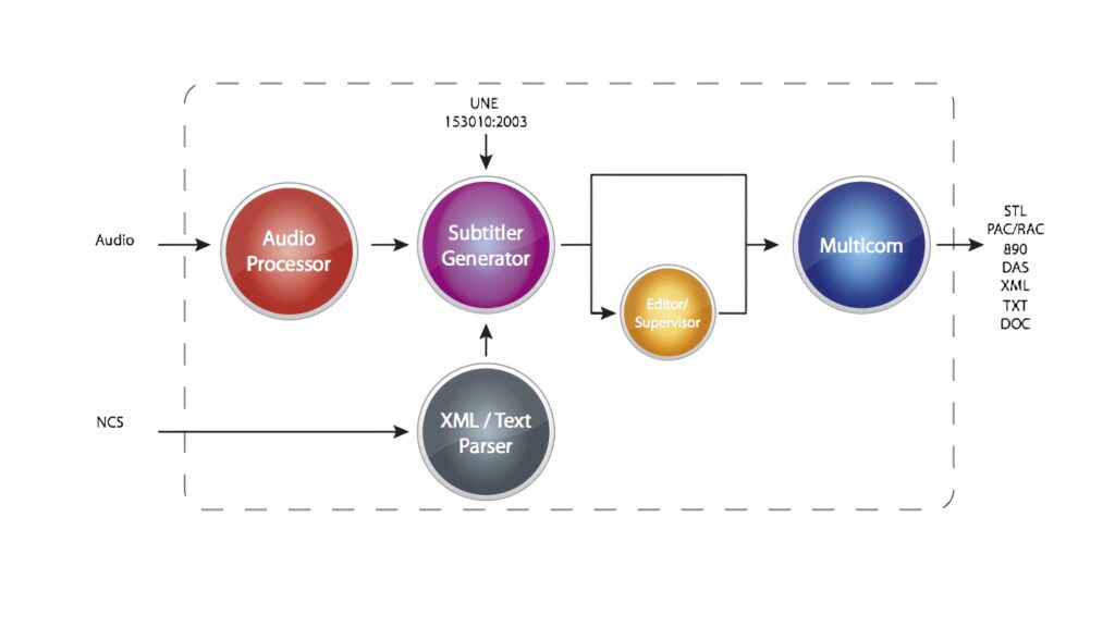 Adiutor Subtitler, subtitulación automática Escrito por el Adiutor Subtitler es una solución para entornos broadcast de subtitulación automatizada para emisiones en directo y grabaciones guionizadas. Se compone de un equipamiento hardware mínimo y diversos módulos software que permiten adaptar la solución a cualquier sistema de redacción informatizada (NCS) y de incrustación de subtítulos. Una vez configurado, el sistema no requiere de intervención humana y puede funcionar de forma autónoma 24/7, reduciendo significativamente los costes de un sistema de subtitulado manual. Diagrama de bloques AdiutorSubtitler Folleto comercial